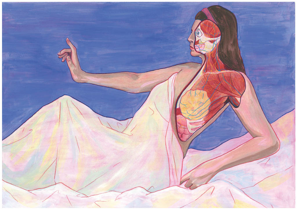 Cette illustration propose une réinterprétation contemporaine de la déesse Artemis centrée sur son anatomie, en particulier la poitrine. Les seins y sont traités comme un lieu d’étude anatomique autant que symbolique afin d’interroger la façon dont les corps féminins sont montrés, regardés et représentés en illustration scientifique aujourd’hui.