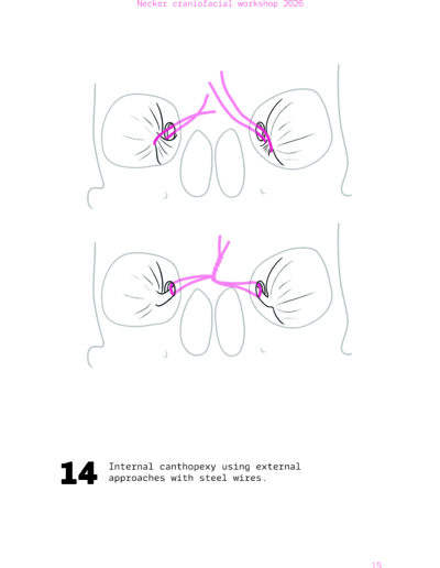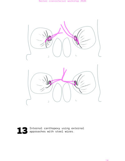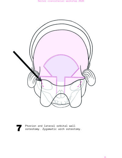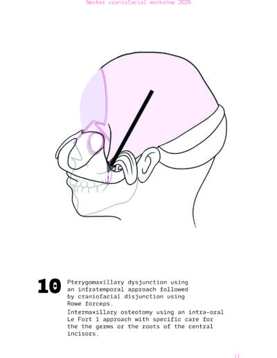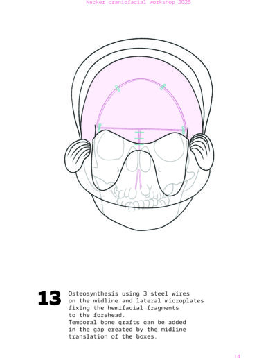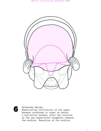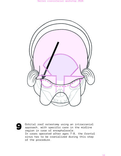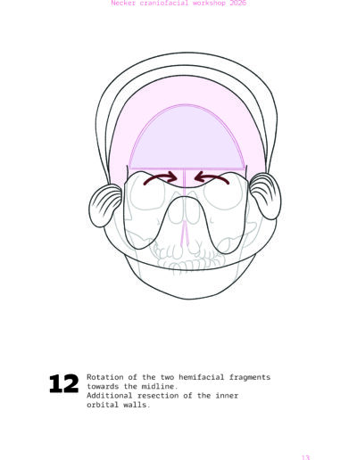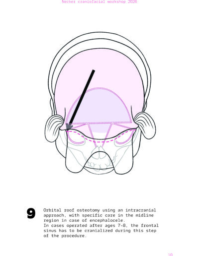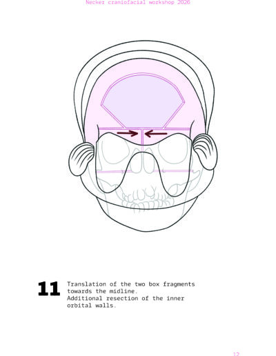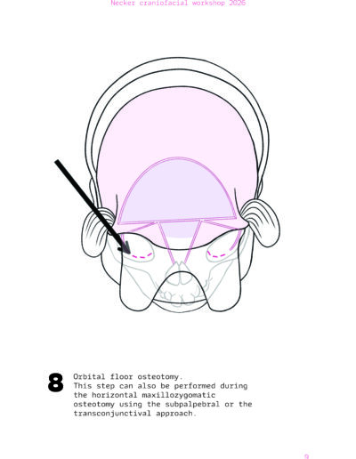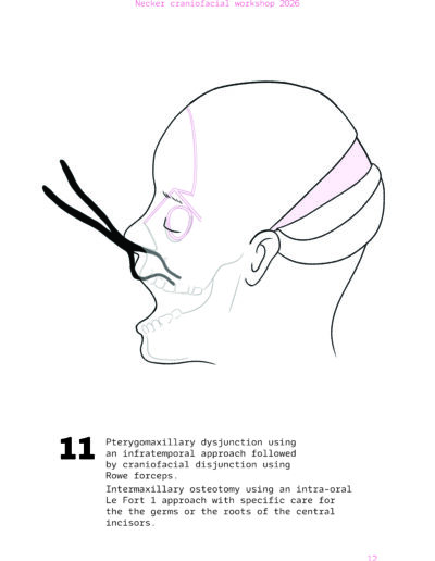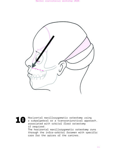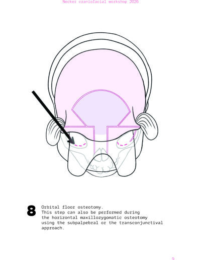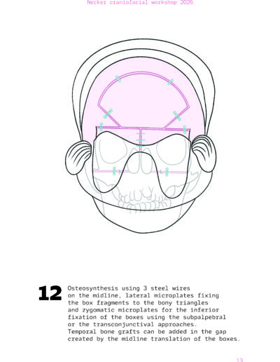 Dans un langage visuel clair et schématique, chaque séquence opératoire est décomposée pour faciliter la lecture des ostéotomies, des mobilisations osseuses et des corrections orbitales.