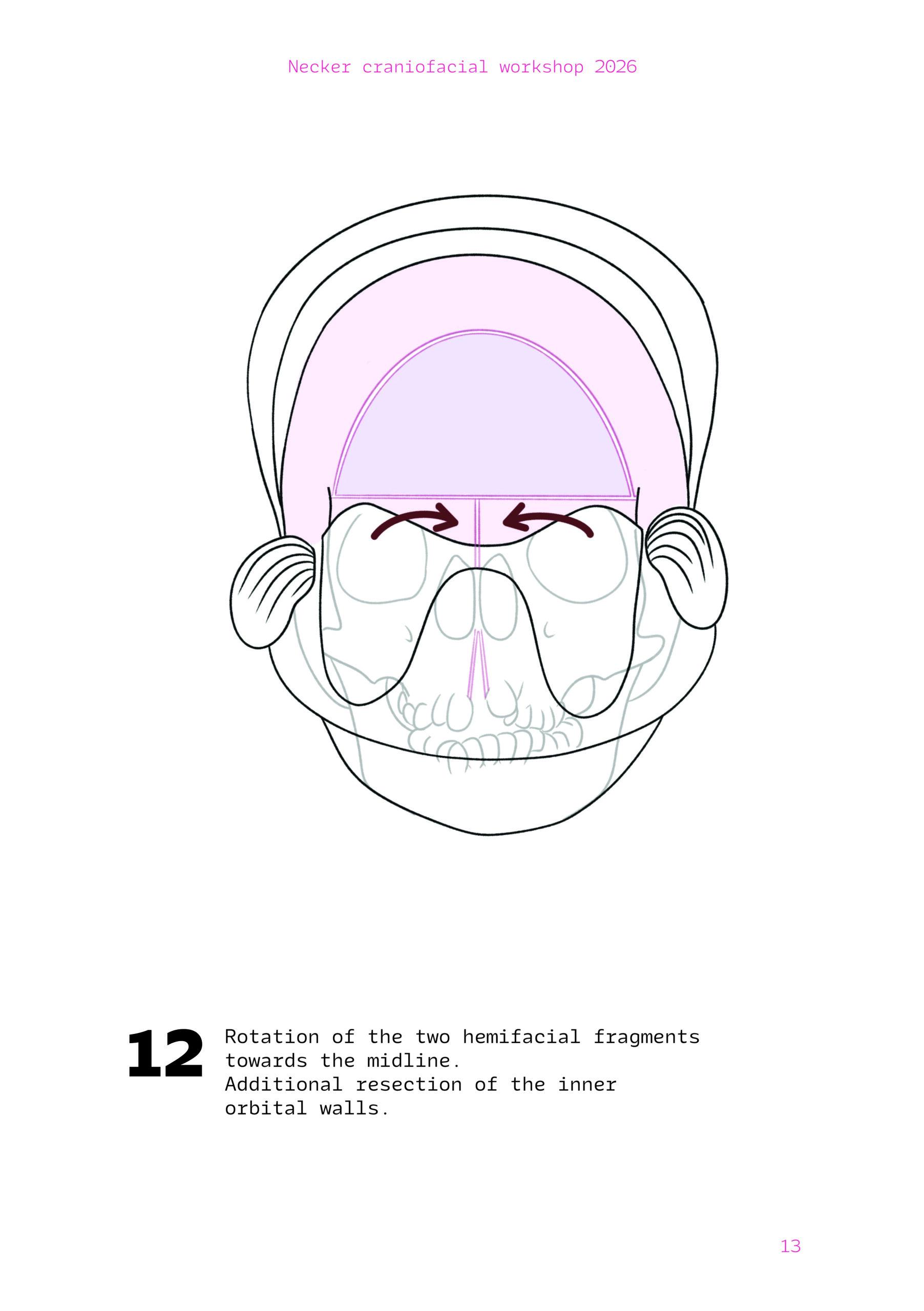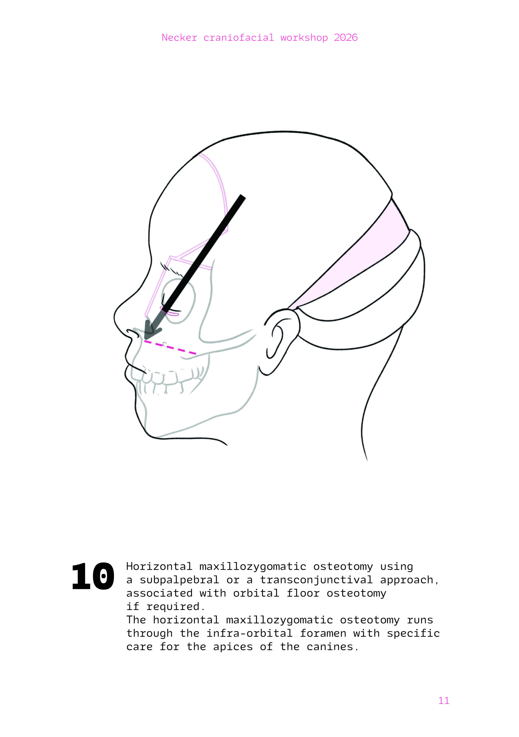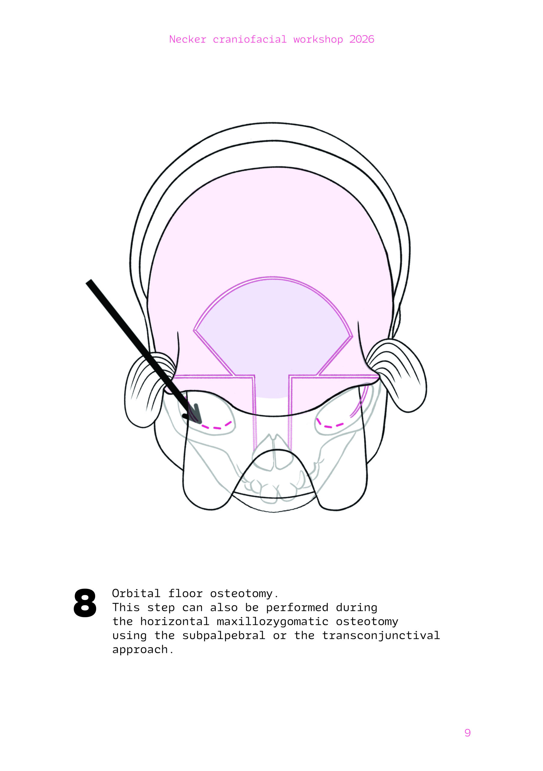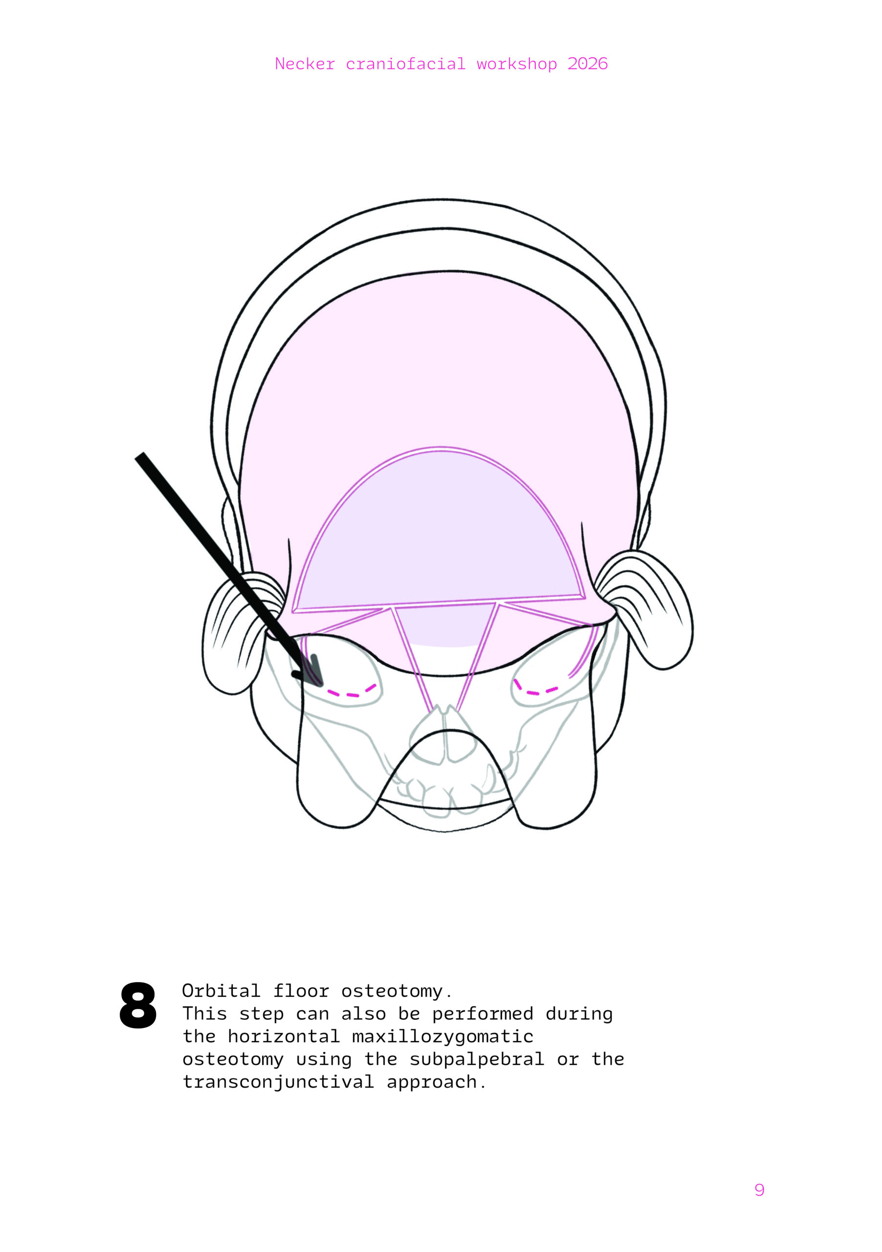 Dans un langage visuel clair et schématique, chaque séquence opératoire est décomposée pour faciliter la lecture des ostéotomies, des mobilisations osseuses et des corrections orbitales.